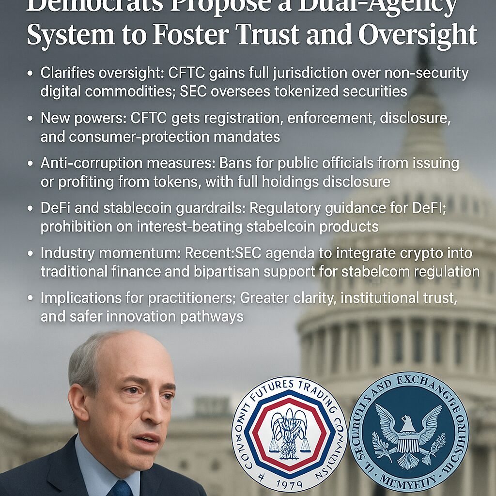 The Senate Democrats’ proposed crypto regulatory framework marks a potential watershed moment for American digital assets. By delineating jurisdiction between the CFTC and SEC, augmenting regulator capacity, imposing safeguards against political abuse, and governing DeFi and stablecoins, the proposal aims to level the playing field—for both protectors and innovators. Paired with prior progress like the GENIUS Act and in contrast to competing bills, this initiative could enable the U.S. to lead responsibly in the next phase of financial innovation. Whether the Senate can translate this blueprint into law will shape the future trajectory of blockchain integration into mainstream markets.