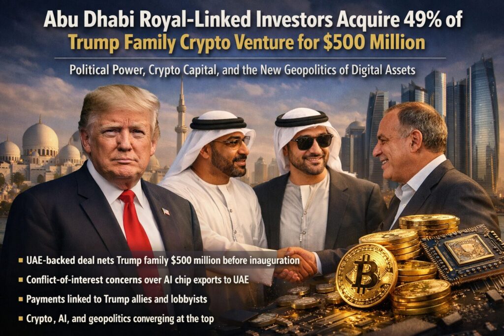 - UAE-linked investors associated with Abu Dhabi royal circles agreed to acquire 49% of World Liberty Financial (WLFI), a Trump family–owned crypto company, for $500 million just days before Donald Trump’s inauguration.