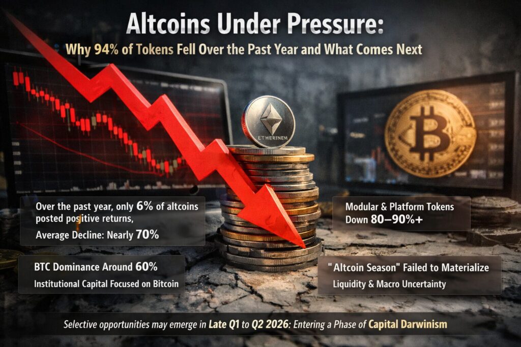 The past year marked a turning point for the altcoin market. With 94% of tokens declining and average losses nearing 70%, the era of effortless narrative-driven gains appears to be over.