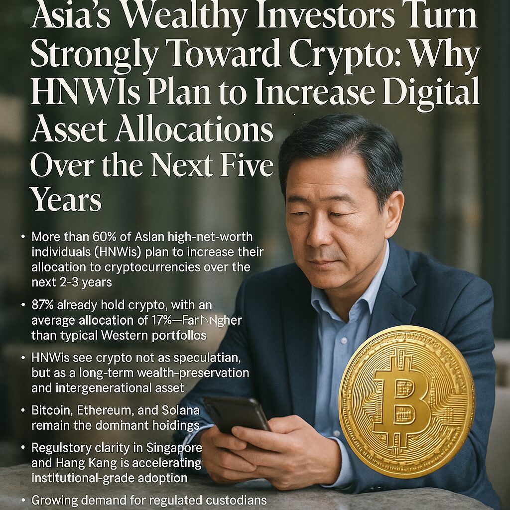 - More than 60% of Asian high-net-worth individuals (HNWIs) plan to increase their allocation to cryptocurrencies over the next 2–5 years.