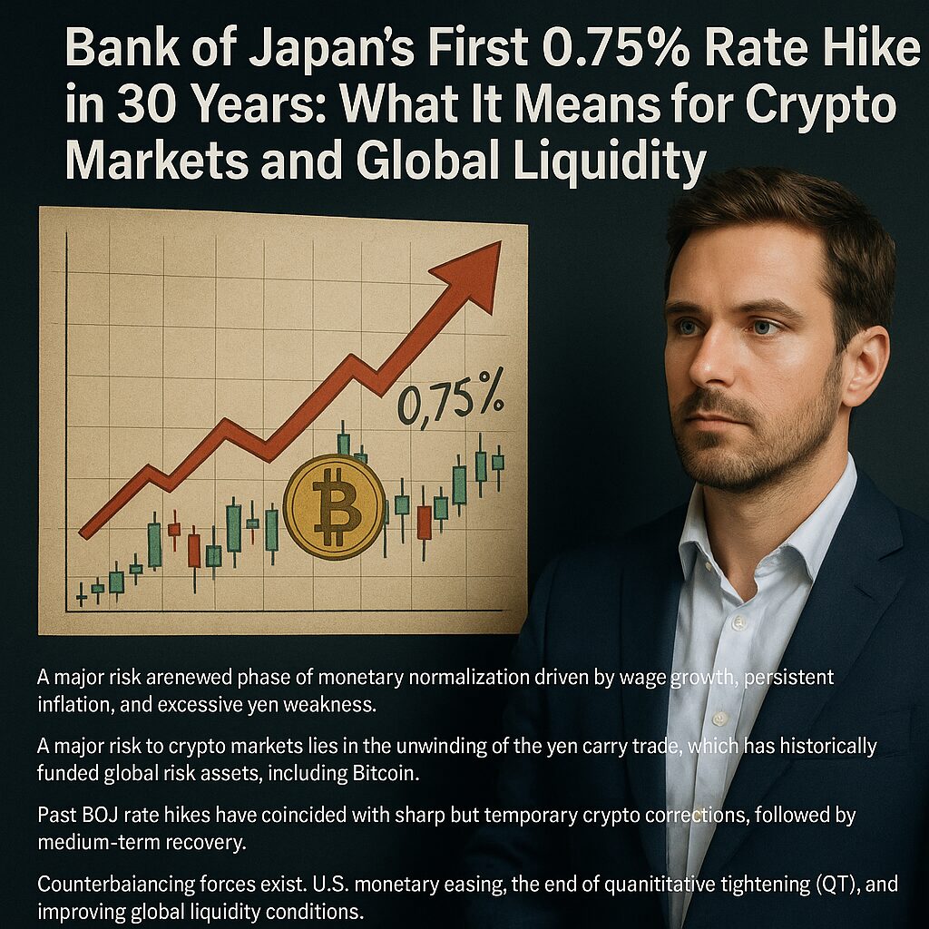 The Bank of Japan’s anticipated move to 0.75% marks more than a rate hike—it symbolizes the end of an era that quietly fueled global risk-taking for decades. For crypto markets, the key risk lies in the unwinding of the yen carry trade, which could trigger volatility and sharp corrections.