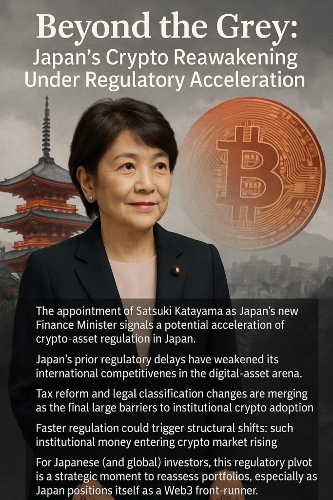 Japan is at a crossroads: the country can either continue its cautious posture in the digital-asset arena or seize the moment to become a global Web3 leader. The appointment of Finance Minister Satsuki Katayama, combined with proposed tax-, legal- and institutional-reforms, marks a potential inflection where crypto assets move from fringe speculation into mainstream financial infrastructure in Japan.