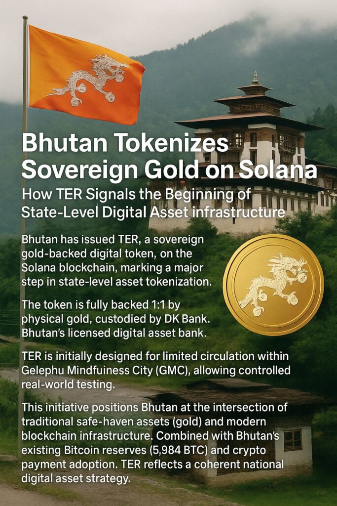- Bhutan has issued TER, a sovereign gold-backed digital token, on the Solana blockchain, marking a major step in state-level asset tokenization.