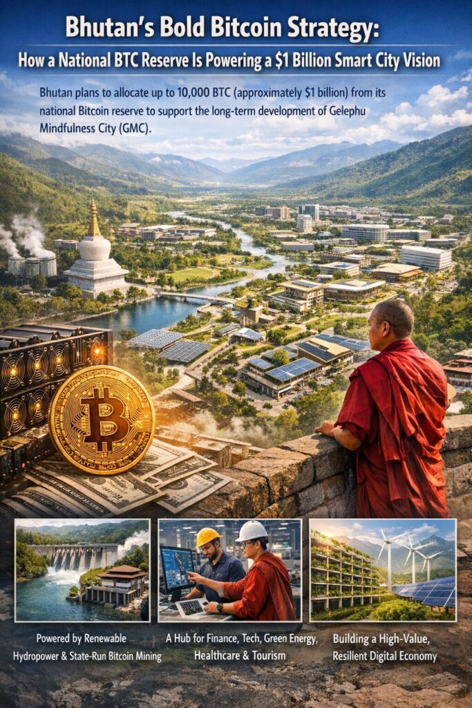 - The initiative is backed by state-run Bitcoin mining powered by renewable hydropower, making Bhutan one of the few countries integrating mining, treasury management, and urban development.