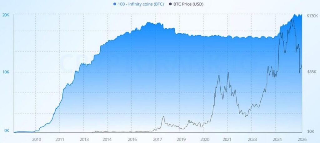 - Bitcoin wallets holding 100+ BTC have surpassed 20,000, marking a major structural milestone