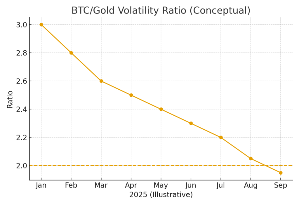 - The Bitcoin-to-gold volatility ratio has fallen below 2.0, meaning Bitcoin now “consumes” somewhat less incremental risk capital relative to gold than in past periods.