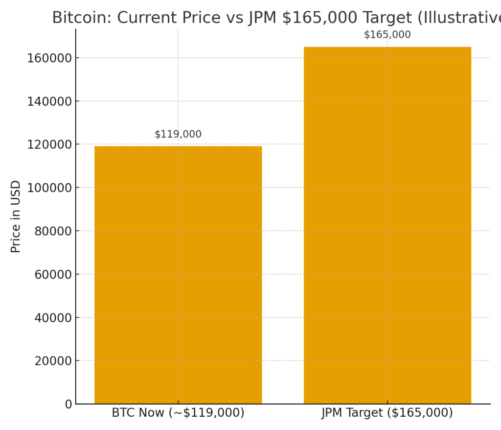 - JPMorgan projects that, on a volatility-adjusted basis relative to gold, Bitcoin could surge from ~$119,000 to ~$165,000 (≈ +40 %).