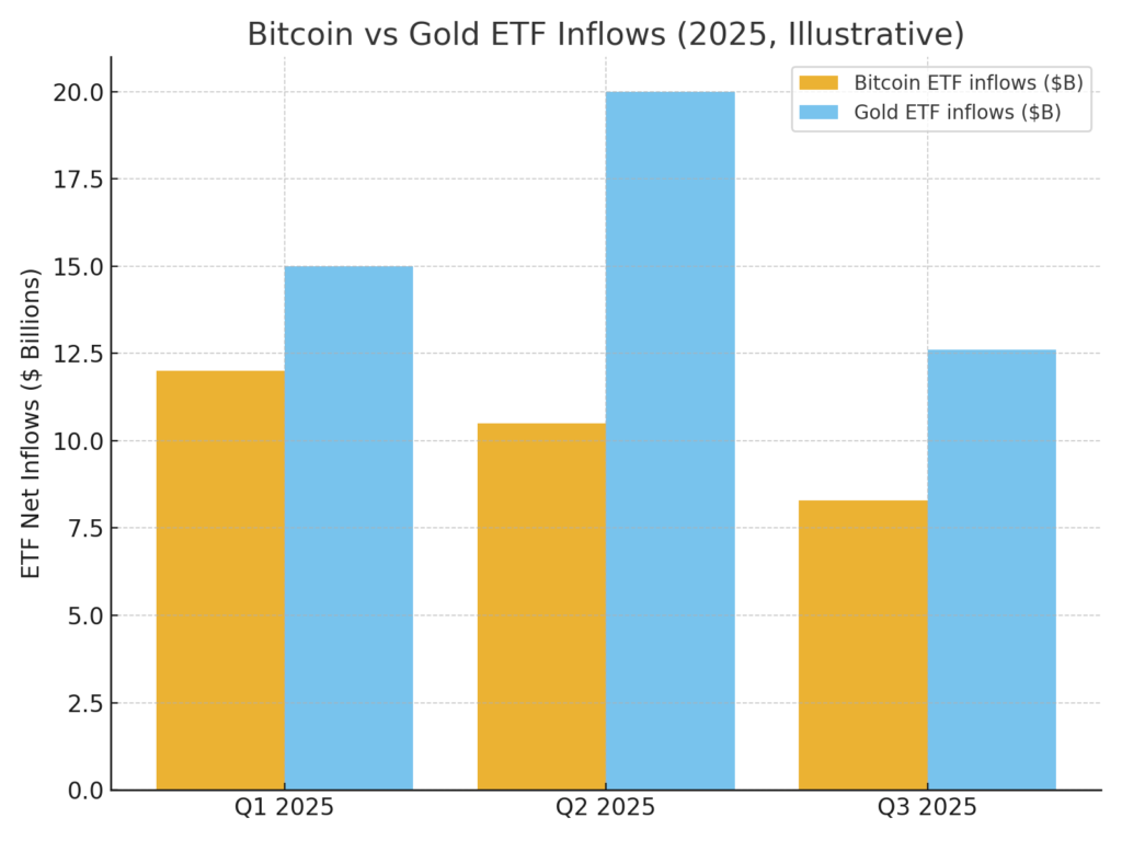 - In 2025, Bitcoin ETFs early in the year saw inflows surpass gold ETFs. But by August, gold ETF inflows sharpened, narrowing the gap.