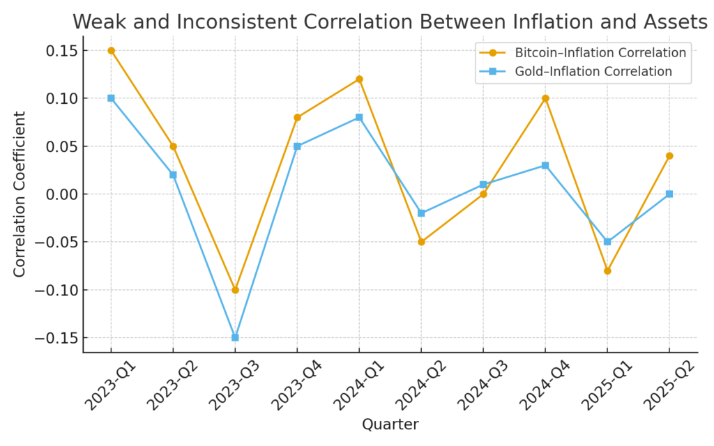Monthly correlation data between inflation indicators (such as CPI or inflation expectations) and Bitcoin’s price show inconsistent and only weak relationships. In plain terms: inflation rising does not reliably mean Bitcoin rising.