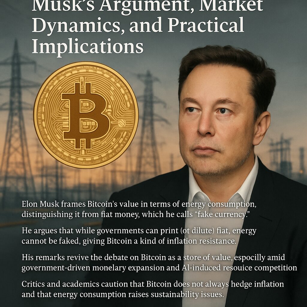Musk’s phrasing—“impossible to fake energy”—presents Bitcoin as a monetary system grounded in physics.