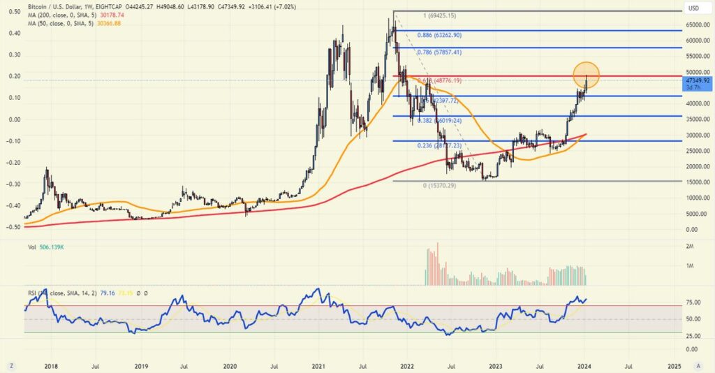 【Daily Bitcoin chart highlighting Fibonacci levels and Ichimoku cloud resistance.】