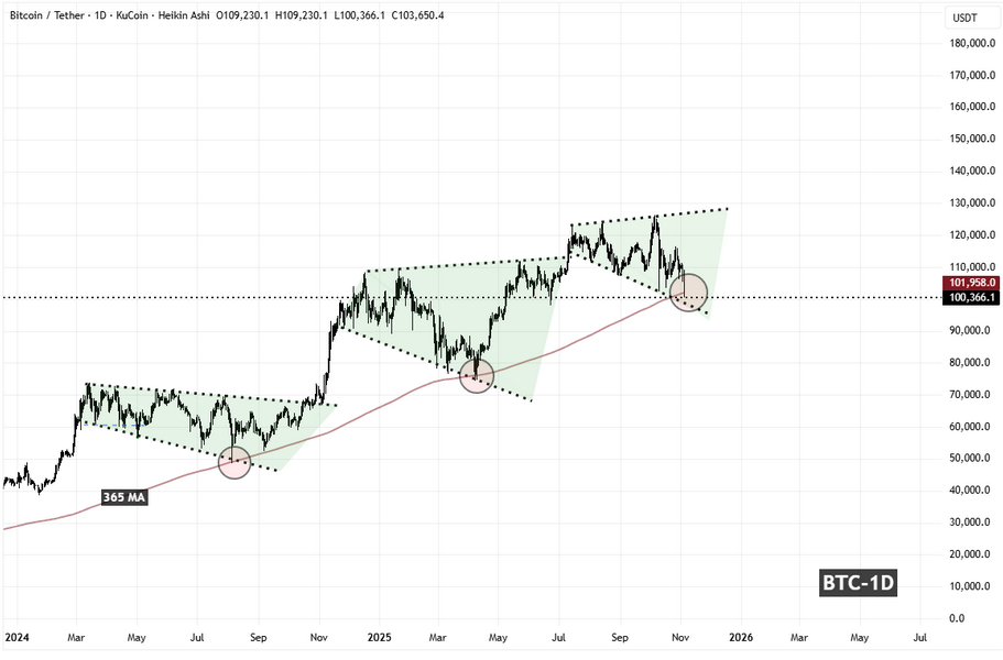 This 365-day MA is widely regarded as one of the most important long-term technical lines for Bitcoin: when the price falls under it, the shift toward pessimism and risk-off behavior tends to amplify.