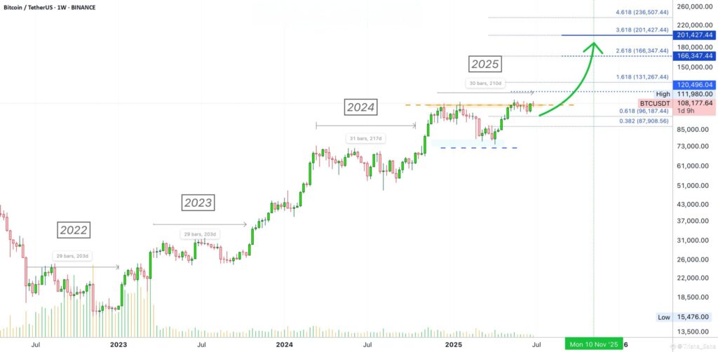 - Bitcoin’s current consolidation closely mirrors the market structure observed before its surge toward $126,000 in 2025.