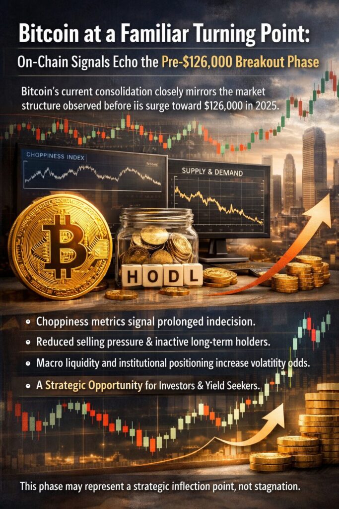 Bitcoin markets have an uncanny tendency to repeat psychological and structural patterns, even if the catalysts differ. The current trading range—defined by compressed volatility, shallow pullbacks, and persistent indecision—strongly resembles the consolidation phase observed in April–June 2025, just before Bitcoin accelerated toward $126,000.