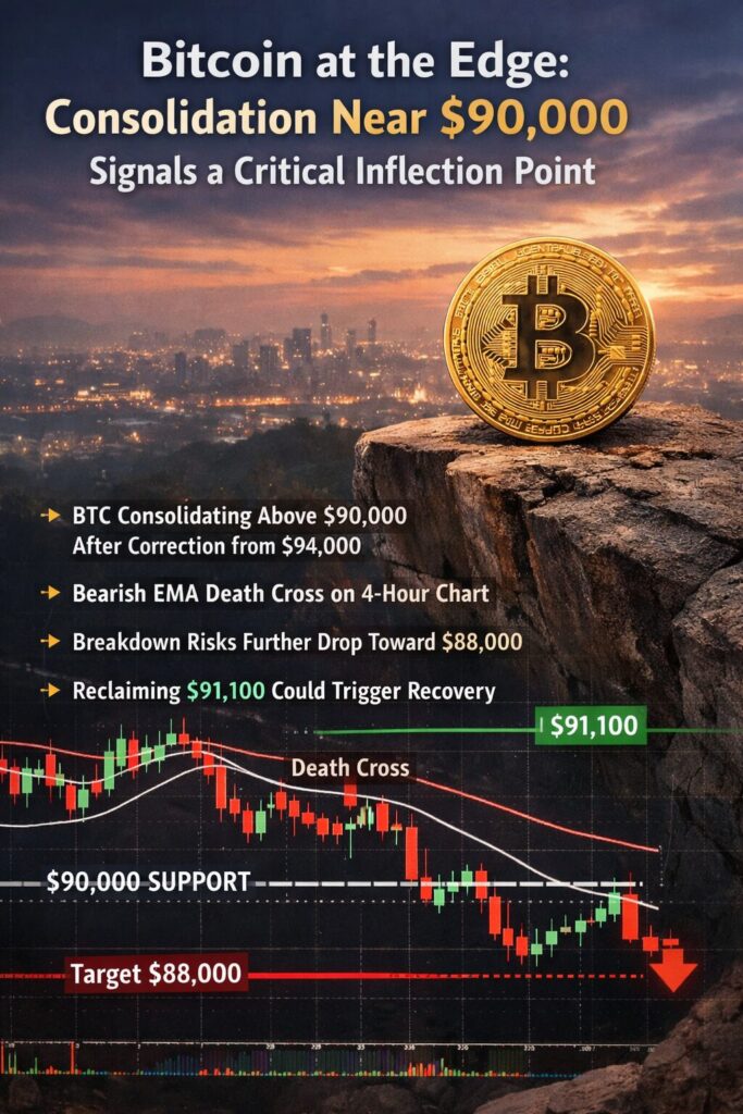 Bitcoin is once again testing the nerves of market participants as price action stagnates near one of the most important psychological thresholds in its history: $90,000. Following a correction from the recent $94,000 high, BTC has entered a narrow consolidation range in the low $90,000s, reflecting a market caught between conviction and hesitation.
