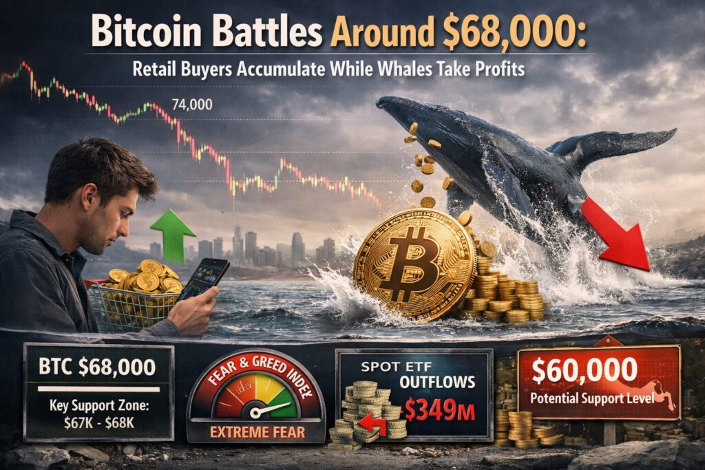 Bitcoin is once again entering a critical battlefield near $68,000, a zone that traders increasingly regard as a decisive short-term support level. After briefly climbing above $70,000 and touching $74,000, the largest cryptocurrency retreated as profit-taking accelerated among major holders.