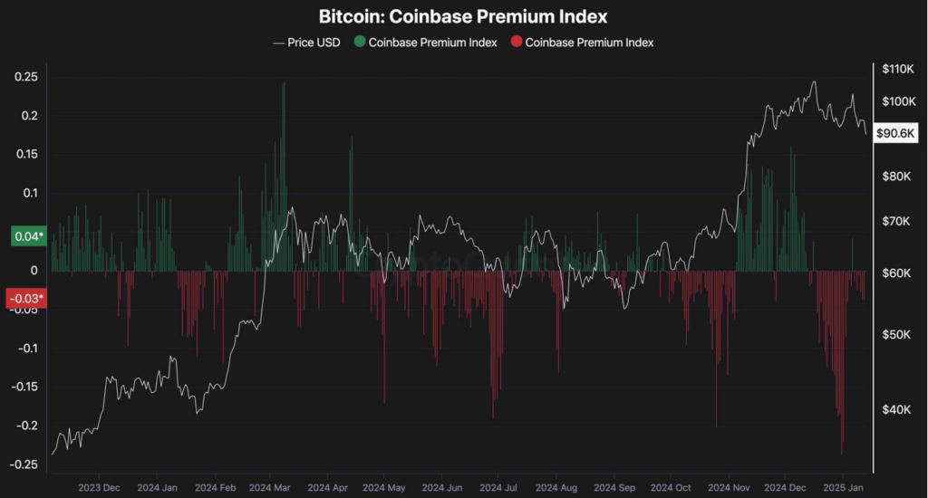 Another key indicator is the Coinbase Premium Index, which measures the price difference between Bitcoin on U.S.-based Coinbase and global exchanges.