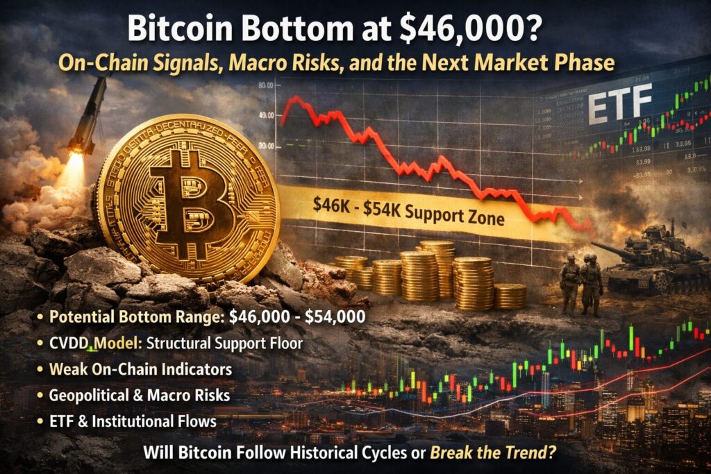 - Bitcoin’s potential bottom range is estimated between $46,000 and $54,000