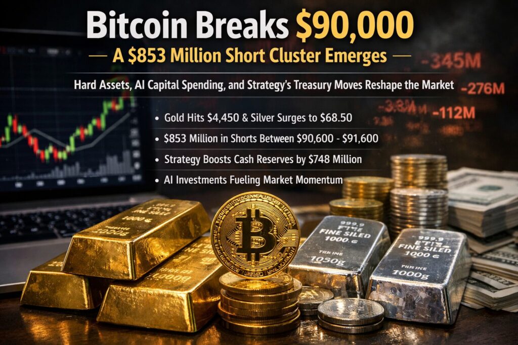 Bitcoin’s recovery above $90,000 reflects more than a technical bounce. It sits at the intersection of record-breaking hard asset performance, aggressive AI infrastructure investment, and continued institutional accumulation. At the same time, derivatives positioning reveals a fragile equilibrium, with a massive short cluster threatening either to cap gains or to ignite a powerful rally.