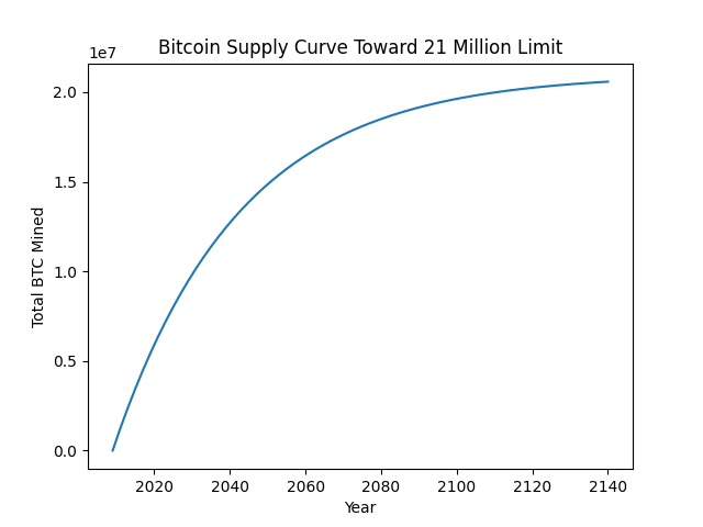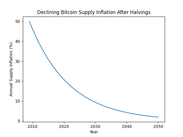 This mechanism ensures that Bitcoin’s supply growth declines exponentially over time.