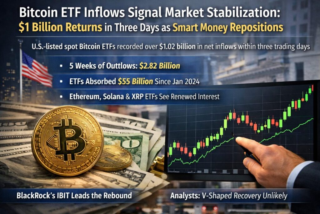 In a significant shift in market dynamics, U.S.-listed spot Bitcoin exchange-traded funds (ETFs) attracted more than $1.02 billion in net inflows over just three trading days this week. The turnaround comes despite Bitcoin trading roughly 50% below its previous all-time high, suggesting that institutional and ETF-based investors may be entering accumulation mode.