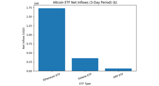 Spot Ethereum ETFs recorded approximately $173 million in net inflows during the same three-day period. Solana ETFs attracted around $35 million, while XRP ETFs saw about $7 million in inflows. Though smaller in magnitude, these figures indicate that investors are broadening exposure beyond Bitcoin.
