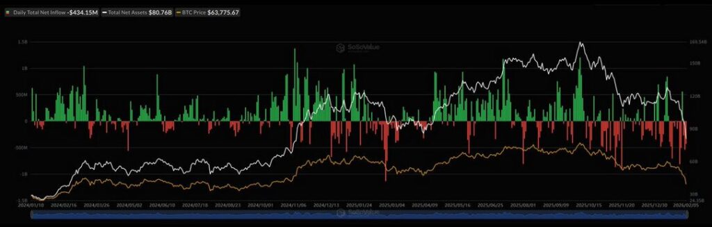 Bitcoin spot exchange-traded funds (ETFs) experienced another day of heavy capital outflows on Thursday, extending a sharp reversal that has now erased nearly $1 billion in assets over just two trading days. According to data from SoSoValue, Bitcoin spot ETFs recorded $434 million in net outflows on Thursday, following $545 million in redemptions the previous day.