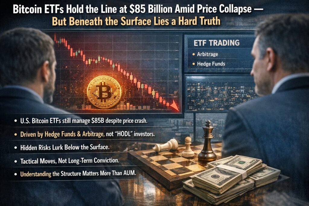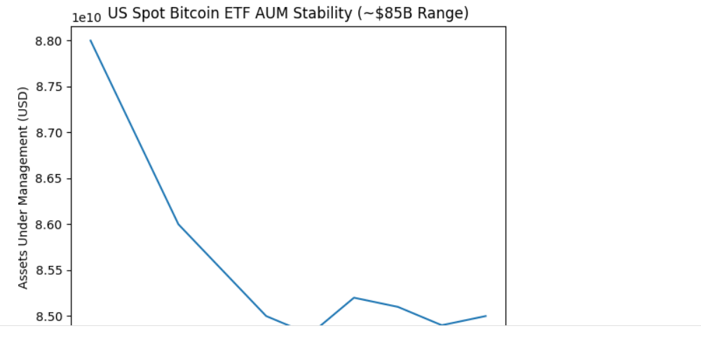 - U.S. spot Bitcoin ETFs continue to maintain approximately $85 billion in assets under management despite Bitcoin’s sharp price decline.