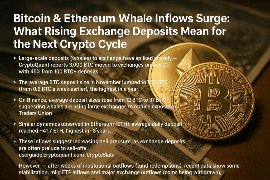 - Large-scale deposits (whales) to exchanges have spiked sharply — CryptoQuant reports 9,000 BTC moved to exchanges on Nov 21, with 45% from 100 BTC+ deposits.
