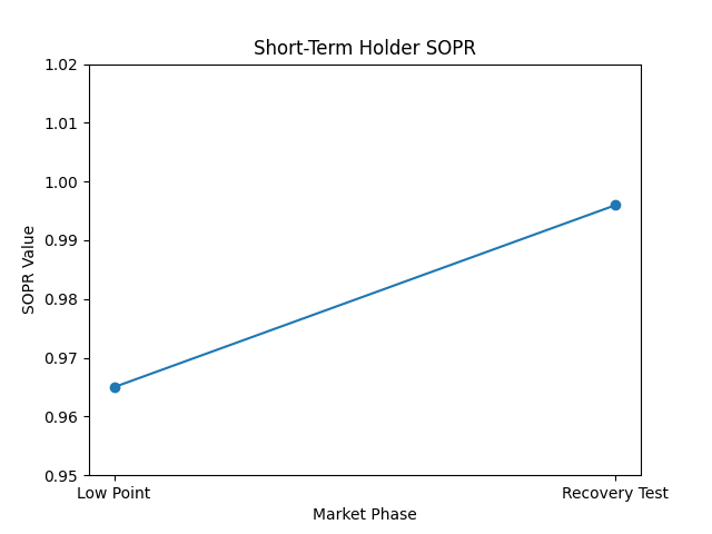 The Spent Output Profit Ratio (SOPR) for short-term holders compares the selling price of coins to their acquisition price. A value above 1.0 indicates profit-taking; below 1.0 indicates loss realization.