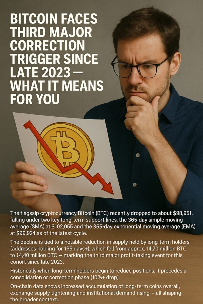 In sum, the recent drop in Bitcoin to approximately US$98,951, undercutting its 365-day SMA and EMA, combined with the third significant long-term holder supply reduction since late 2023, signals that the current bull cycle may be entering a consolidation or correction phase. For investors like you — seeking new crypto assets, income-generating opportunities, and real-world blockchain applications — this means caution is warranted, but also that a clearer lower-risk window may soon emerge once stability returns.