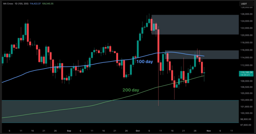 In the recent correction, Bitcoin slipped to about $98,951, dipping under both the 365-day SMA (~$102,055) and the 365-day EMA (~$99,924) — the two major long-term moving averages cited as critical support levels. These indicators had served as the backbone of the current bull cycle’s support regime.