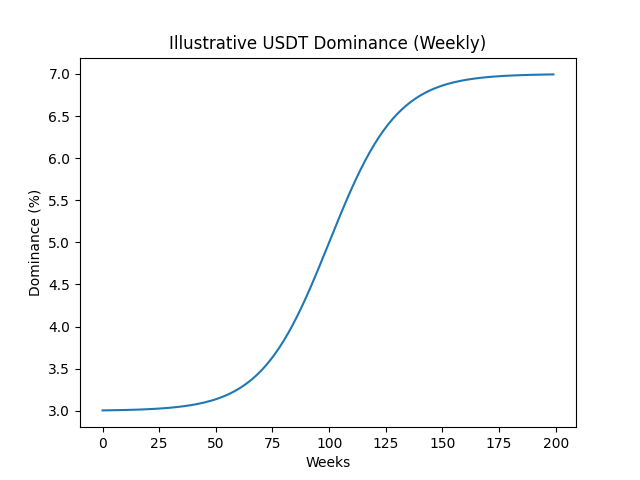 Historically, weekly closes above 6.7% have coincided with confirmed bearish market environments. Rising stablecoin dominance typically reflects capital rotating out of risk assets and into cash-like instruments — a defensive posture by market participants.