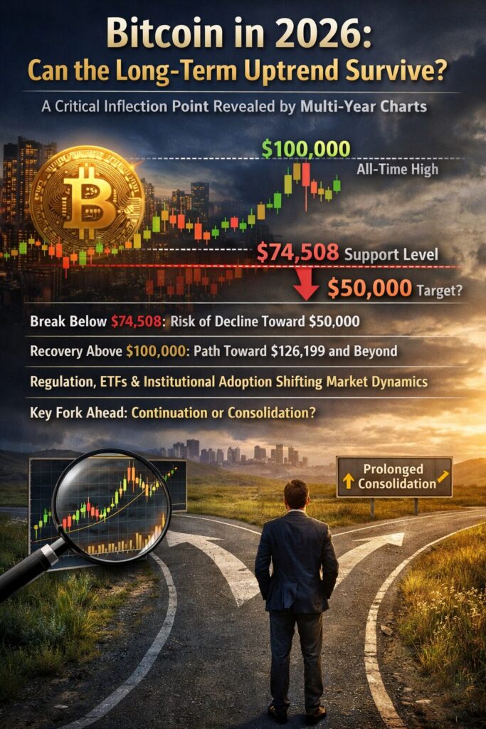 Bitcoin enters 2026 at a genuine inflection point. Long-term charts still support the bullish thesis, but short-term signals warn that complacency is dangerous. The $74,508 level represents a line between structural resilience and deeper correction, while $100,000 remains the gateway to renewed upside.