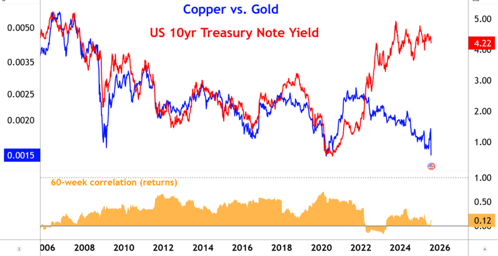 One macro indicator gaining renewed attention is the Copper/Gold (Cu/Au) ratio. Copper is closely tied to industrial activity and global growth expectations, while gold functions as a defensive, risk-off asset. The ratio between the two is therefore widely used as a proxy for global risk appetite.
