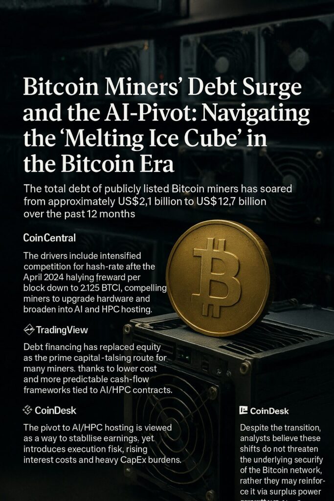 The past 12 months have brought a dramatic transformation in the Bitcoin mining sector. A six-fold surge in debt—from roughly US$2.1 billion to US$12.7 billion—reflects the urgency for mining firms to upgrade hardware, compete in hash-rate, and diversify into AI and HPC hosting. The “melting ice cube problem” succinctly summarises the dynamic: miners must either constantly invest or see their share of rewards erode.
