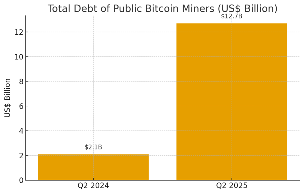 Over the past year, the debt burden carried by publicly traded Bitcoin mining companies has ballooned. According to the most recent analysis by VanEck, the aggregate debt of these operators rose from around US $2.1 billion in Q2 2024 to approximately US $12.7 billion in Q2 2025.