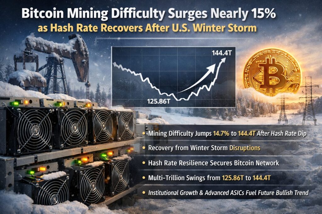 Bitcoin’s mining difficulty increased to 144.4 trillion (T), marking a substantial 14.7% adjustment upward from 125.86T. This sharp rebound follows a previous downward adjustment when severe winter storms in the United States temporarily disrupted mining operations, especially in energy-dense regions such as Texas.