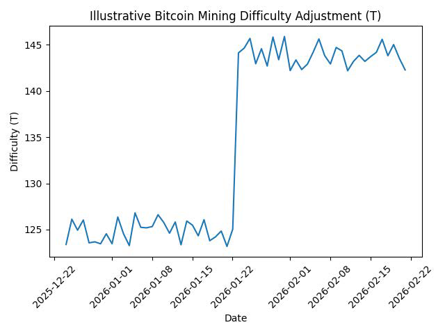 - Bitcoin mining difficulty jumped approximately 14.7% to 144.4T after recovering from a weather-driven hash rate dip.