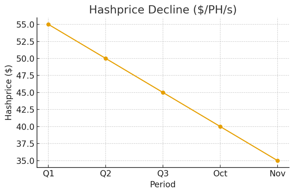In Q3, the average U.S. hashprice was $55 per PH/s per day. By November, it had plunged to $35, a nearly 36% collapse in less than 90 days.