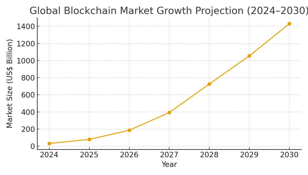 The total blockchain technology market was estimated at US$31.28 billion in 2024 and is projected to swell to US$1,431.54 billion by 2030, growing at a ~90 % CAGR. Such growth implies that blockchain is no longer a niche tech experiment, but a core infrastructure for many sectors.