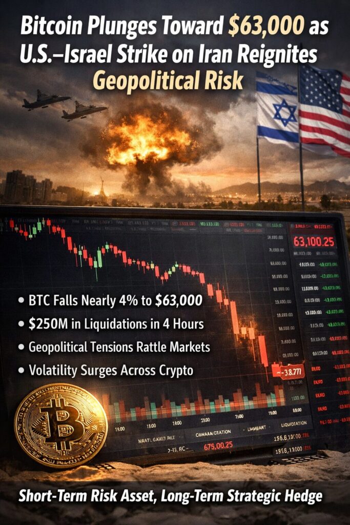Bitcoin’s drop toward $63,000 following U.S.–Israel military action against Iran underscores the increasing integration of crypto markets into global macro dynamics. The immediate reaction—nearly 4% down with $250 million in liquidations—demonstrates how leverage magnifies geopolitical shocks.