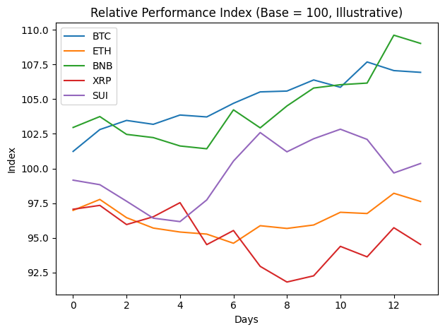 Description: Indexed performance chart (base = 100) comparing BTC, ETH, BNB, XRP, and SUI over the past two weeks.