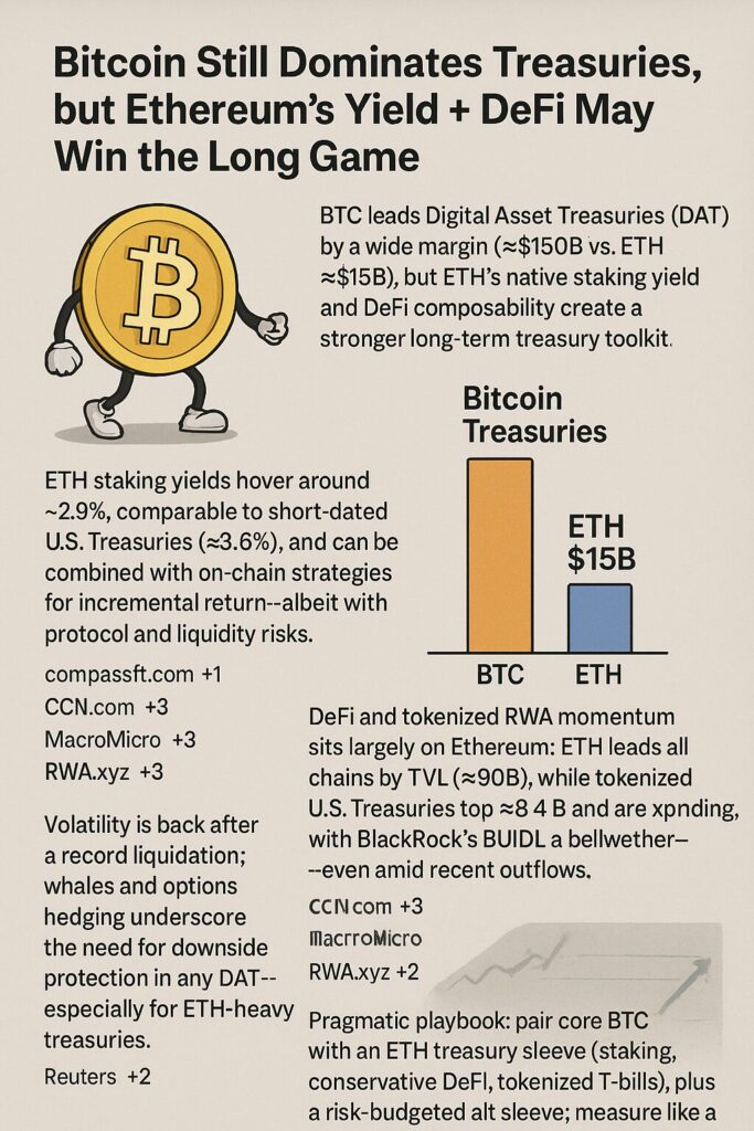 • Pragmatic playbook: pair core BTC with an ETH treasury sleeve (staking, conservative DeFi, tokenized T-bills), plus a risk-budgeted alt sleeve; measure like a corporate treasury, not a trading desk.
