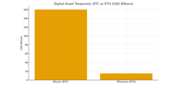 • BTC leads Digital Asset Treasuries (DAT) by a wide margin (≈$160B vs. ETH ≈$15B), but ETH’s native staking yield and DeFi composability create a stronger long-term treasury toolkit.
