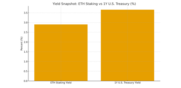 • ETH staking yields hover around ~2.9%, comparable to short-dated U.S. Treasuries (~3.6%), and can be combined with on-chain strategies for incremental return—albeit with protocol and liquidity risks.