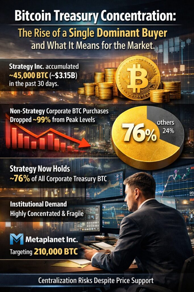 In contrast, all other corporate treasury participants combined purchased only about 1,000 BTC (~$70 million) during the same period. This represents a 99% decline from the peak in August 2025, when corporate Bitcoin accumulation was widely distributed across multiple firms.
