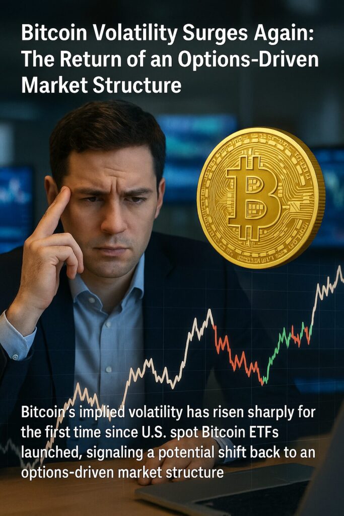 - Bitcoin’s implied volatility has risen sharply for the first time since U.S. spot Bitcoin ETFs launched, signaling a potential shift back to an options-driven market structure.
