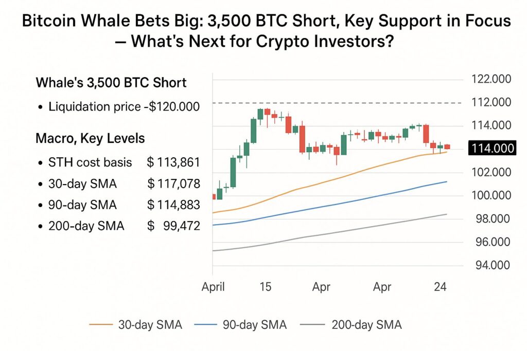 The 3,500 BTC short by a whale has captured market attention — but it’s not a standalone signal. It sits at the intersection of support drawn from short-term holder cost basis (near $113,861), converging moving averages, and macro volatility risks from global trade dynamics.