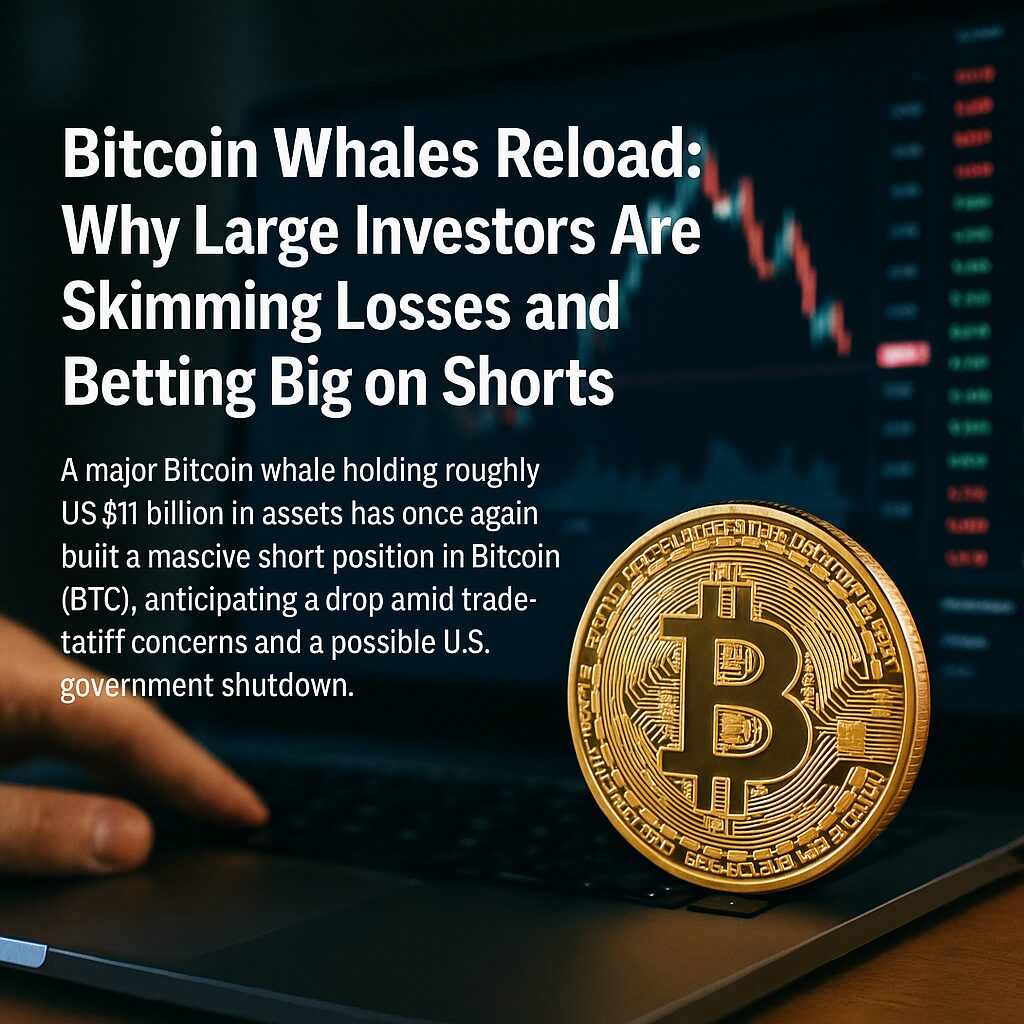 - A major Bitcoin whale holding roughly US $11 billion in assets has once again built a massive short position in Bitcoin (BTC), anticipating a drop amid trade-tariff concerns and a possible U.S. government shutdown.
